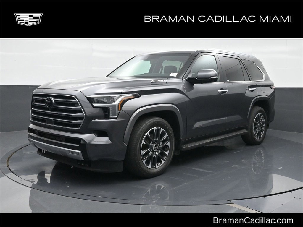 Braman Cadillac Miami is Proud to offer you this Exceptional 2024 Toyota Sequoia, Appointed with the Limited Trim and is finished in Magnetic Gray Metallic over Black Leather inside. Highlight features include One Owner, Clean CarFax, All Service Records, Factory GPS Navigation, Power Sunroof / Moonroof, Panoramic Moonroof, Premium Leather Interior, Factory Alloy Wheels, Premium Alloy Wheels, Factory Chrome Alloys, Rearview Backup Camera, Power Rear Liftgate, Bluetooth for Phone, Premium Package, Luxury Package, and 3rd Row Seating V6 Hybrid, 10-Speed Automatic, 4WD, ABS brakes, Active Cruise Control, Alloy wheels, Electronic Stability Control, Front dual zone A/C, Heated & Ventilated Front Seats, Heated door mirrors, Heated front seats, Illuminated entry, Low tire pressure warning, Navigation System, Power Liftgate, Power moonroof, Remote keyless entry, and Traction control And it is ready for your consideration today! V6 Hybrid 10-Speed Automatic 4WD